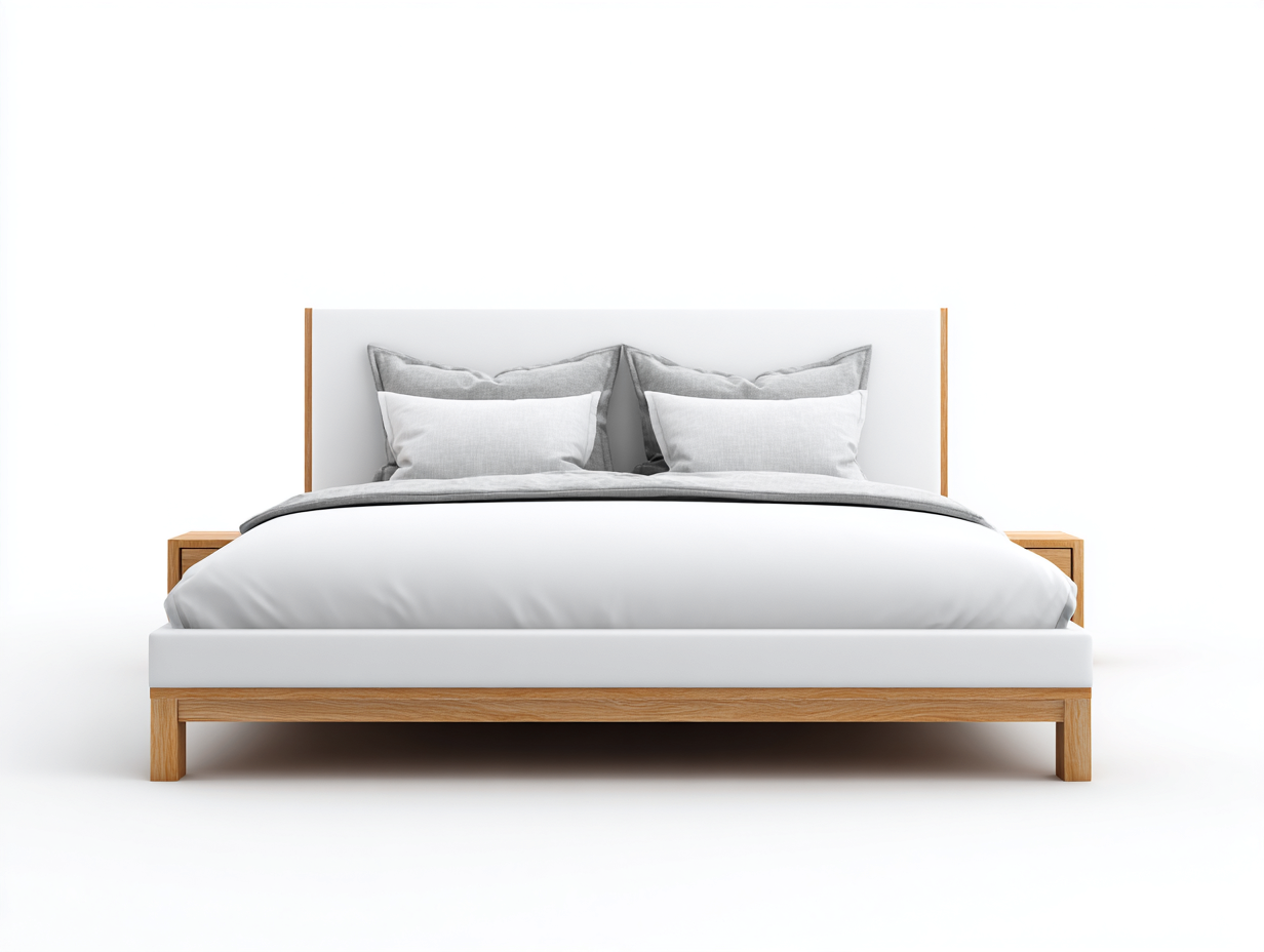 Der stabile Rahmen besteht aus Holz in Naturfarbe und sorgt für eine langlebige Konstruktion. Das Kopfteil ist mit weißem Stoff gepolstert und bietet eine angenehme Oberfläche zum Anlehnen. Die sorgfältige Verarbeitung unterstützt eine stabile Struktur und eine harmonische Optik.