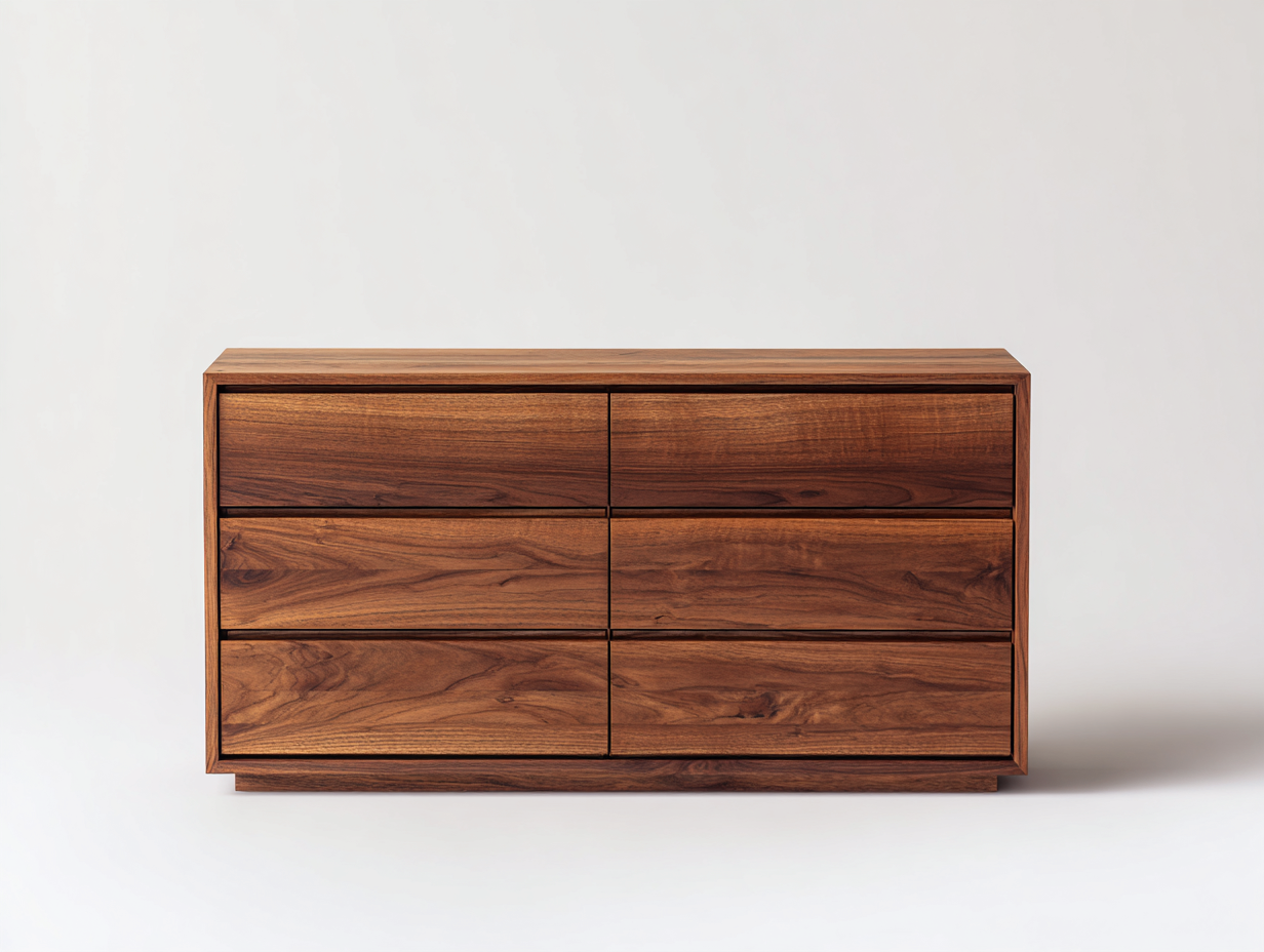 Die Kommode besteht aus Holz in brauner Farbe mit sichtbarer natürlicher Holzmaserung. Die Oberfläche ist sorgfältig verarbeitet und sorgt für eine angenehme Haptik sowie eine langlebige Nutzung. Das schlichte Design unterstreicht den natürlichen Charakter des Materials.