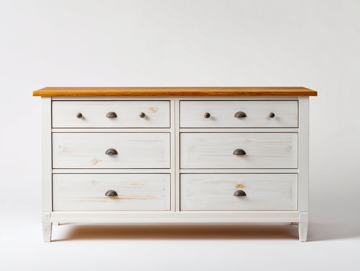 Die Kommode besteht aus Holz mit weißer Oberfläche und einer Deckplatte in Naturholzfarbe. Die sichtbare Holzstruktur unterstreicht den natürlichen Charakter des Möbelstücks. Metallgriffe ergänzen das Design und unterstützen eine stabile und komfortable Nutzung im Alltag.